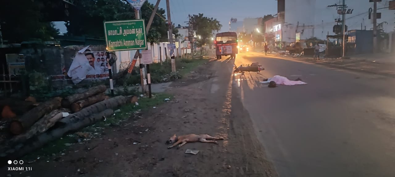 இதனால் கட்டுப்பாட்டை இழந்த வாகனம் சறுக்கி இருவரும் கீழே விழுந்தனர். அந்த நேரத்தில் பின்னால் வந்த அரசு பேருந்து தவிர்க்க முடியாமல் மோதியதால் கணவன்–மனைவி இருவரும் சம்பவ இடத்திலேயே உயிரிழந்தனர். குறுக்கே வந்த நாயும் உயிரிழந்தது.